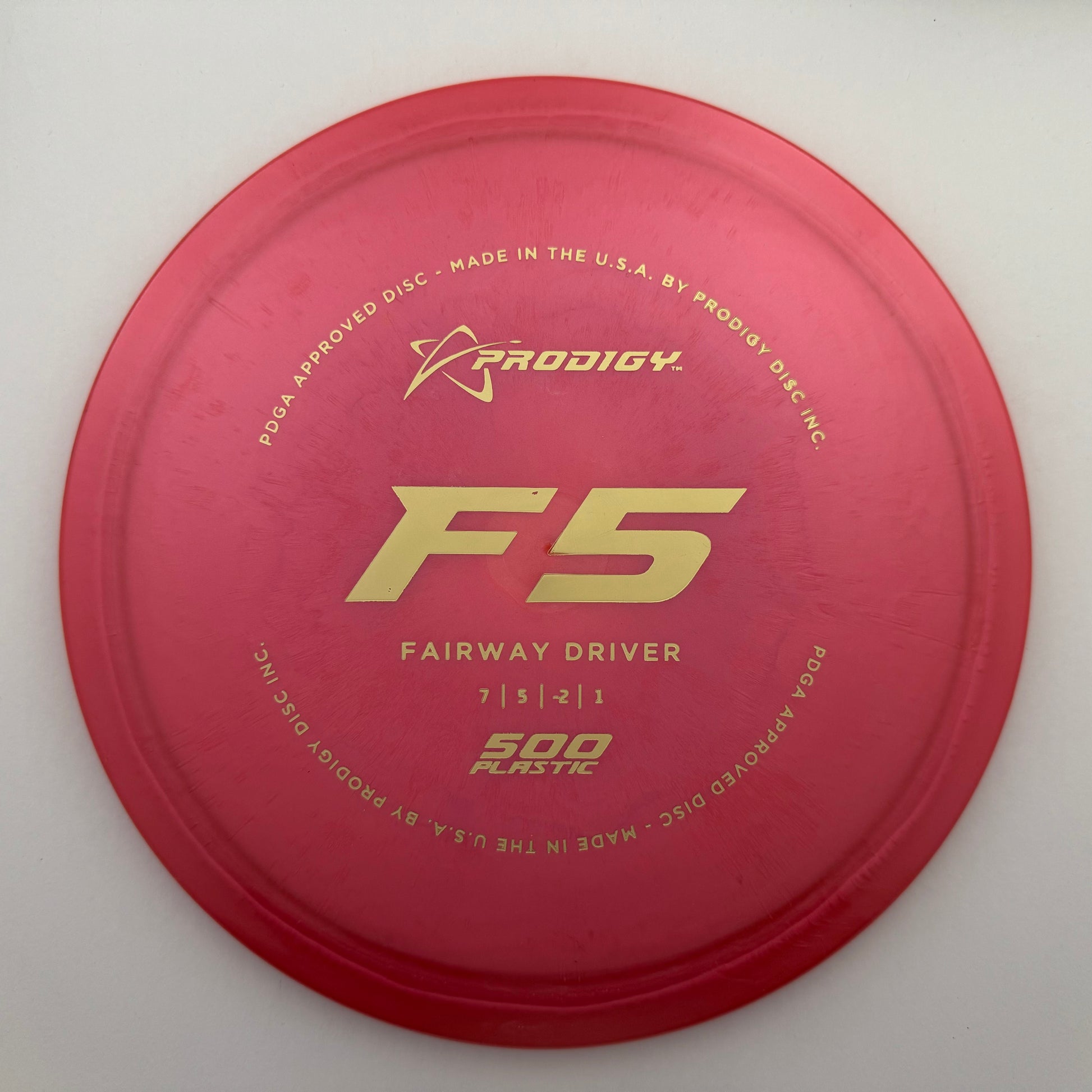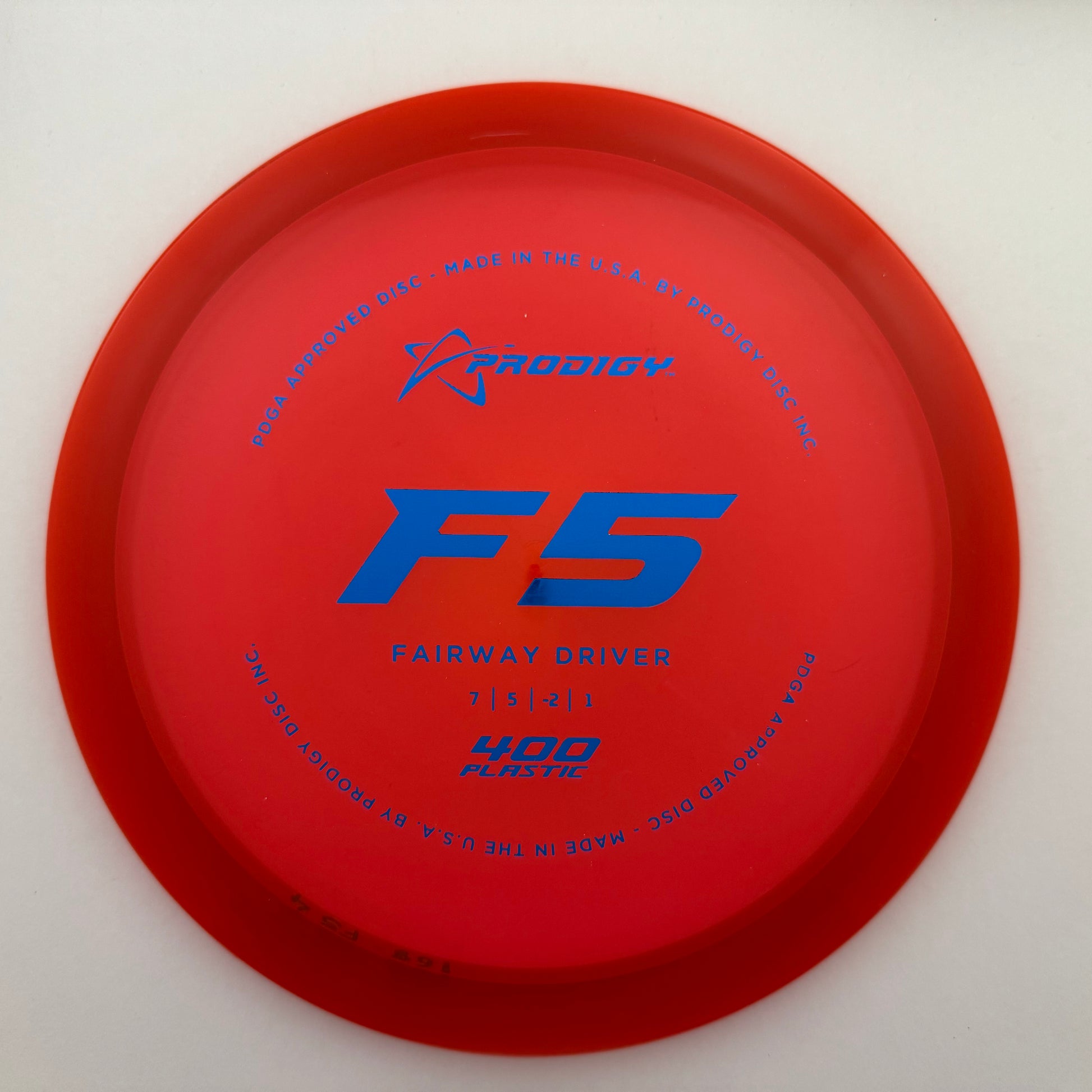The Prodigy Disc F5 is a high speed , stable to under stable fairway driver. It is designed for all skill levels and flies extremely far and incredibly straight. The F5 will turn up slightly when thrown hard it will go into a long glide before finishing gently to the stable side.