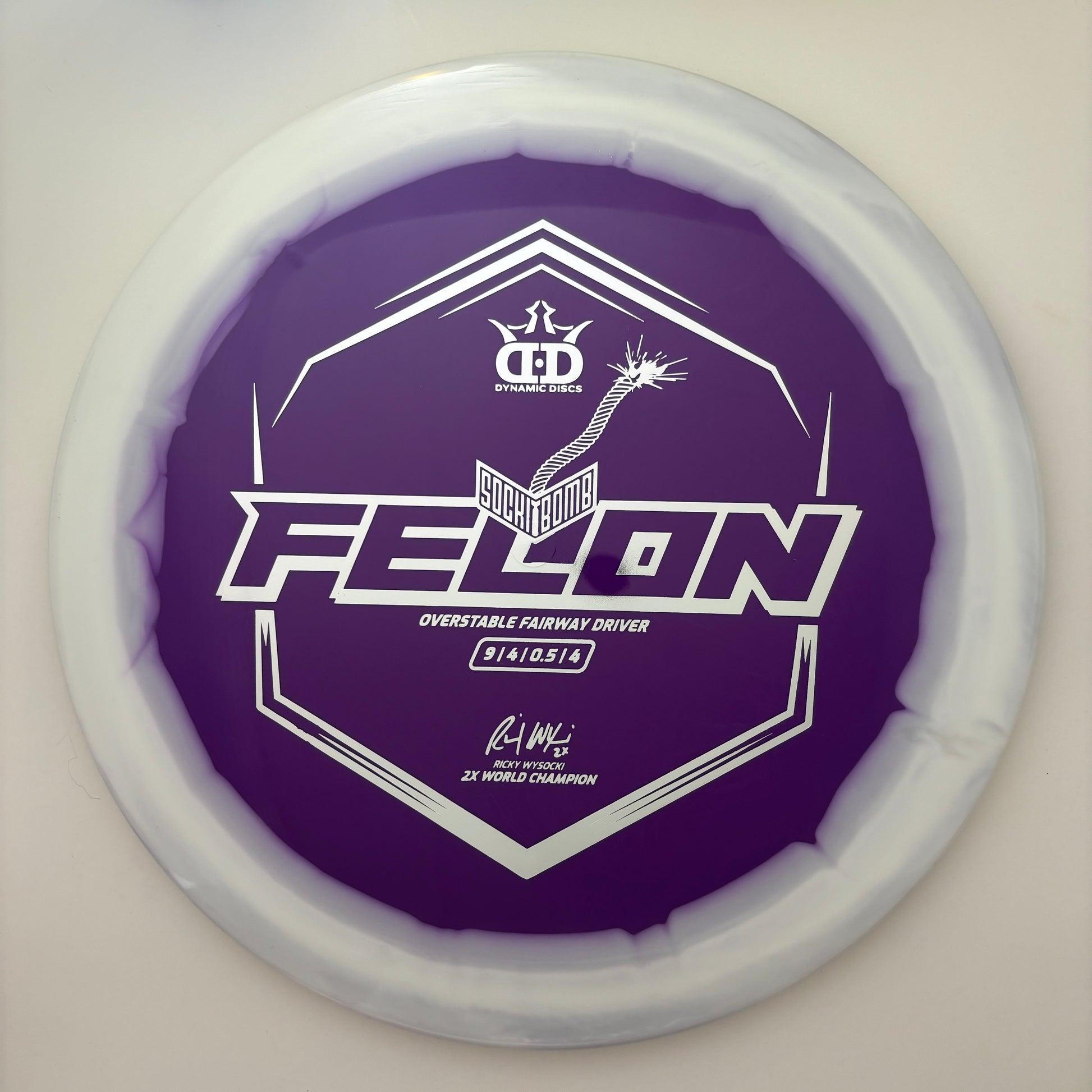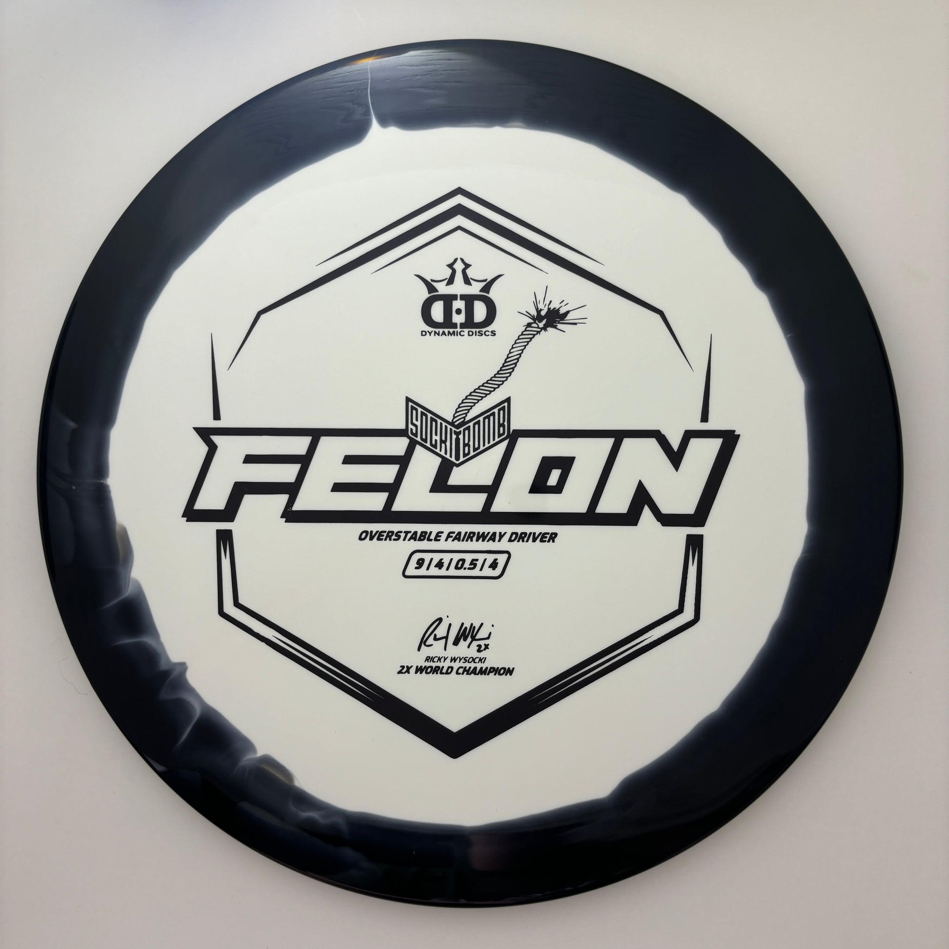 The ultimate overstable disc designed by 2-time world champion disc golfer, Ricky Wysocki. Made from the highest-quality Supreme plastic from Dynamic Discs, this disc is built to last and deliver outstanding performance. The Supreme plastic offers a perfect combination of soft feel, rigid rim, and perfect flex, providing players with superior grip, durability, and comfort in all playing conditions. The Sockibomb Felon's unique overstable flight characteristics make it an ideal choice for forehand throws. Its ability to handle power and deliver tight, accurate lines makes it perfect for players looking for a dependable forehand disc. Whether you're a pro or just starting out, the Sockibomb Felon is a perfect choice for disc golfers looking for a high-performance disc that can handle power and deliver results. Get your hands on the Sockibomb Felon today and experience the ultimate in disc golf performance.