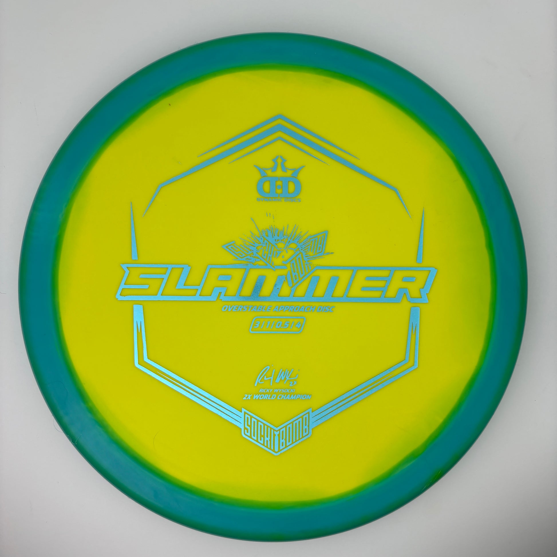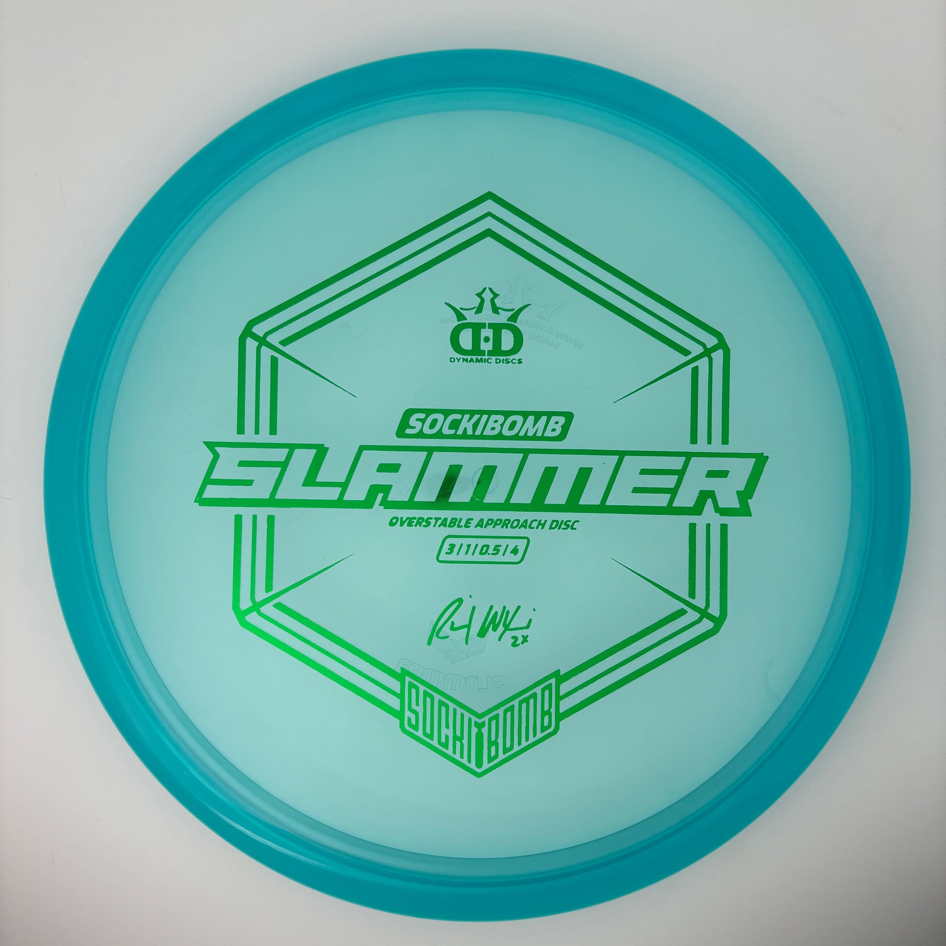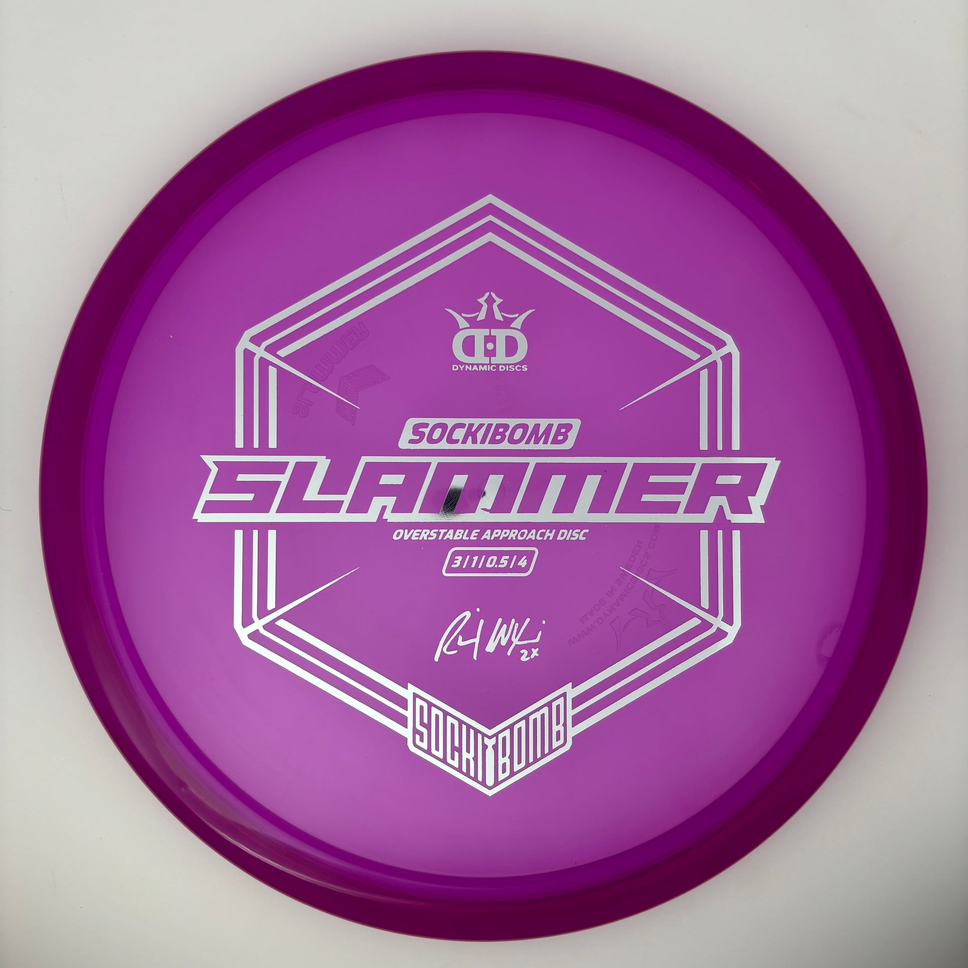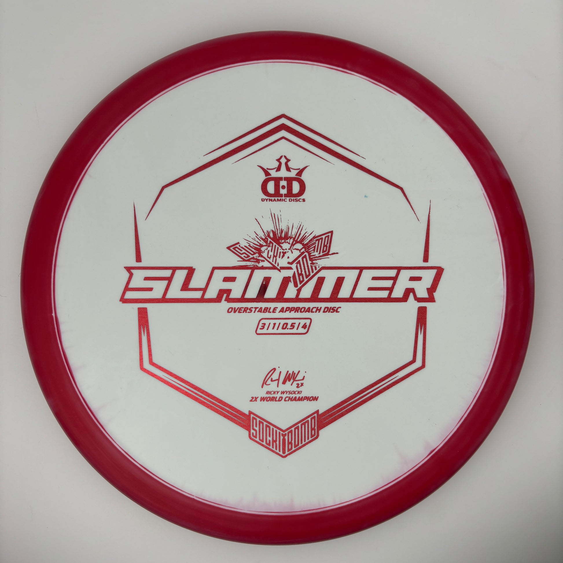 The Sockibomb Slammer is a popular mold based on the grip of the original Dynamic Discs Slammer and the consistency Ricky Wysocki loves in the Westside Discs Harp. The dependability of the Sockibomb Slammer is a must have for players of all skill levels and arm speeds. It is a super overstable throwing putter that can be thrown both backhand and forehand with a predictable finish every time, even into a strong headwind. It was created in collaboration with 2x World Champion Ricky Wysocki and is here to improve your approach game.