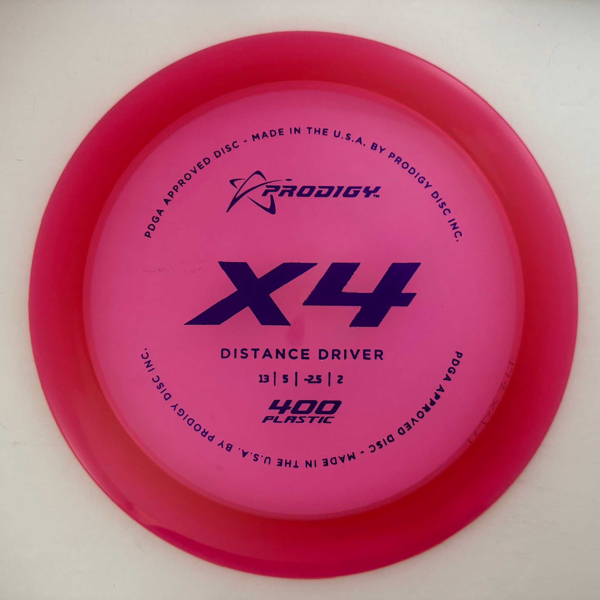 The Prodigy Disc X4 is a slightly understable, low profile, high-speed distance driver. It is great for players with lower arm speed that are looking to gain more distance. The X4 is designed to hold a turnover even at a lower speed. The X4 performs very well at low heights and in tunnel shots. For players with faster arm speed, the X4 will flip later in the flight path and is perfect for long wooded shots or accurate turnovers.